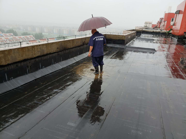 (上图为大龙物业职工冒雨疏通楼顶雨落管)